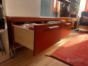 Pregiato mobile per televisore con libreria, cassetti e ante in legno e vetro lunghezza 300cm altezza 185cm profondità 58cm