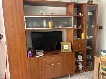 Mobile é una parete attrezzata da soggiorno in legno con vetrina integrata ideale per ospitare un televisore e cassetti e anta per organizzare oggetti vani a giorno ideale per libri o piccoli soprammobili. Ritiro a proprie spese e a domicilio