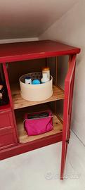mobile in legno rosso anticato con 2 cassetti e un vano sopra, 2 antine con 2 ripiani.