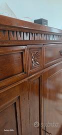 • Dettagli: Cornice sottotop lavorata e decorazioni floreali intagliate sui montanti. Maniglie e bocchette in metallo brunito originale. Trasporto a carico dell'acquirente.