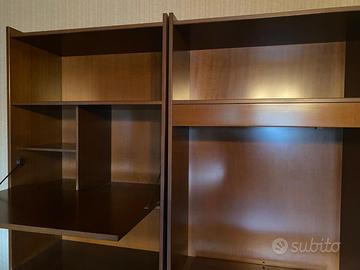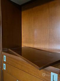 Color noce, struttura modulare composta da parte bar, televisione e angoliera. Mensole, cassetti ed antine basse