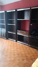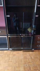 Mobile sala parzialmente smontato. I vetri poggiati a terra corrispondono alla parte alta del mobile da cui sono stati tolti. Nell’ultima foto è un’idea di come sarebbe il mobile con le porte montate.
