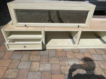 Vendo mobile sala, stile country-classico ,color panna,artigianale in legno. Mobile contenitore basso lunghezza 270 cm composto da ripiano e cassetto sottostante e due moduli a pensile con ante in vetro fume’ ,lunghezza 132 cm ciascuno.
