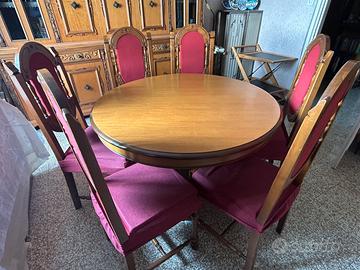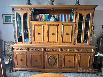 Mobile in legno per sala da pranzo con spazio libreria annesso e vetrinette espositive. Molo ampio e abbellito da legno intagliato. Viene venduto insieme a un tavolo rotondo allungabile e sei sedie in legno rosse abbinate allo stile del mobile.