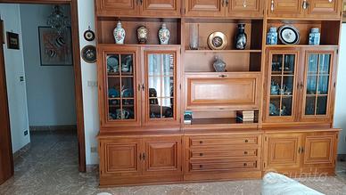 Mobile molto capiente in legno massello con ripiani, cassetti, ante e sportello a ribalta dello scomparto bar.