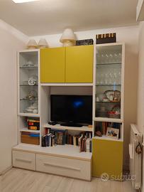 Mobile sala altezza 227 cm profondità 60 cm lunghezza 200.5 Mobile contenitore con vetrine cassetti e porta televisore o libreria Semi nuovo colore bianco e giallo oro