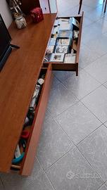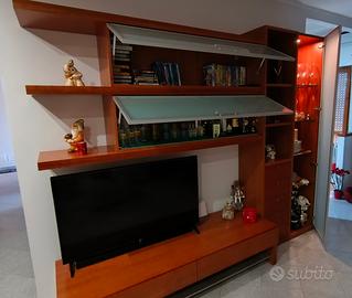 elegante e di buona qualità, vendiamo a malincuore per cambio tipo di arredamento. Ad un prezzo così basso solo perché ha alcune piccole bolle uscite sotto il trasparente, come da foto. Il mobile completo di 2 grandi scomparti alti ad apertura vasistas, modulo cristalliera verticale con illuminazione, 5 cassetti e due cassettoni salva spazio nella base. color ciliegio, non eccessivamente sul rosso.