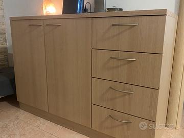 Mobile fatto su misura da falegname, con foro passacavi e spazio dietro per eventuali ciabatte senza che si vedano
