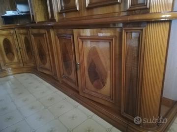 Mobile sala soggiorno componibile ad angolo laccato color noce con intarsi vendo. Comprende vetrine e nicchia per tv. In ottime condizioni. Il mobile è già smontato pronto per il trasporto.