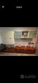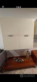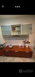MOBILE COLOR CILIEGIO LUNGHEZZA CM 180 ALTEZZA CM 41 CON PIEDINI CM 11 E PROFONDITA CM 54 CON ANNESSA PANCHETTA CON PIEDINI CM 11 PROFONDITA' CM 54 LUNGHEZZA 135 CM. SOPRA MOBILE 4 ANTE LACCATO PANNA LUNGHEZZA 120 CM ALTEZZO 115 CM E PROFONDITA' CM 38 CON ANNESSO VETRINETTA LACCATA PANNA LUNGHEZZA CM184 ALTEZZA 56,5 E PROFONDITA' CM 38,5 CONDUE ANTE SCORREVOLI E VANO AL CENTRO LIBERO.