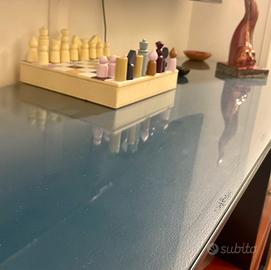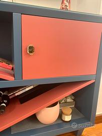 Monile salotto realizzato a mano da un esperto falegname con 2 vani contenitori chiusi e 2 scomparti aperti con mensola obliqua. Colore blu e rosa malva. Dotato anche di vetro protettivo. Altezza 81 cm Profondità 40 cm Lunghezza 1,30 m