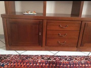 Mobile salotto in legno massiccio color noce: libreria, cassetti, porte e angolo porta tv.
