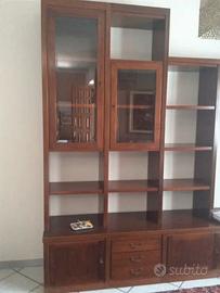 Parte bassa composta da tre porte, quattro cassetti e angolo a giorno con due mensole. Parte alta composta da due porte in vetro, scaffali libreria e mensole sopra angolo. Ottime condizioni solo angolo leggermente da ritoccare.