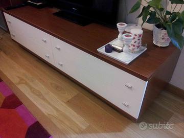 Vendo o scambio mobile porta tv tinta panna e ciliegio prodotto in Italia (no Svezia no Cina) la porzione a cassettoni misura in lunghezza mt 1,80x0,60 di profondita’ ed è alta da terra 55 cm. E’ spostabile in quanto poggia su robuste ruote. La porzione verticale (vetrinette) sono alte circa mt 2,00 e larghe 0,45 cm l’una, per un totale di 90 cm in quanto si possono accoppiare. Misura effettiva in lunghezza mobile piu’ vetrinette mt 2,70 Una vetrinetta e’ a vista mensole e l’altra chiusa con anta di vetro. Le tre mensole a muro non sono in vendita. Tutto il mobile è in vendita ad euro 380,00 trattabili. Oppure lo scambio con aspirapolvere Folletto vk 140 o 150 funzionanti ed in buone condizioni. E’ gia’ tutto smontato e custodito a Piove di Sacco. Se interessati contattatemi per altre informazioni. Trasporto a cura dell’acquirente Grazie