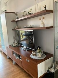 Mobile salotto 3 metri color legno laccato due colori principali: •Legno marrone caldo: usato per la base, i cassetti, il piano della TV, i bordi e le mensole. •Pannelli color crema/avorio chiaro: presenti sulle ante e sul retro delle mensole.