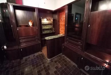 Mobile con angolo bar (penisola in marmo), vetrine con luci, cassetti e mobili con ante.