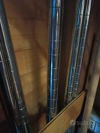 Splendido mobile/scaffale a giorno composto da 4 pali in acciaio alti circa 2 metri, con piedini regolabili in altezza, compreso di 5 mensole in legno misura 40X40 cm, possibilità di sistemare le varie mensole ad altezze diverse, è stato utilizzato pochi mesi come porta documenti, ma si può benissimo integrare ad una cabina armadio