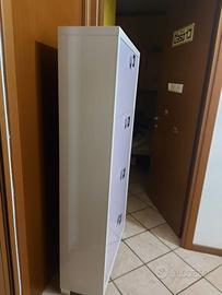 Struttura in legno nobilitato sp. 20mm ed ante sp. 16mm, bordo PVC senza angolo vivo. Ante a ribalta doppia profondità per scarpe fino al numero 47. Maniglie e piedini verniciati cromo satinato. Ante laccate lucido. Misure cm h. 154 x p. 29 x l 70