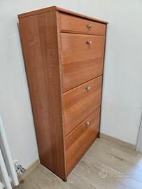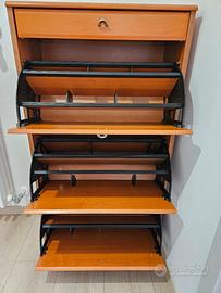 Vendo mobile scarpiera bella comoda comprensiva sopra di un piccolo cassetto e sotto di 3 ante che a sua volta hanno dentro ognuna 3 vari ripiani modificabili sia in altezza che in larghezza per regolarsi con la grandezza delle varie scarpe. Ci sta qualche piccolo striscio ma non vistoso che se mai spedisco eventuale foto. Son disponibile per aiuto a caricare, ma non spedisco.