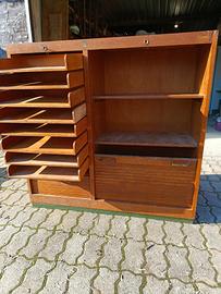 Splendido e funzionale mobile da ufficio/negozio vintage originale, caratterizzato dalle iconiche chiusure a serranda a scorrimento verticale. Realizzato in legno massello e impiallacciato di rovere, questo pezzo unisce il fascino del design industriale d'epoca a una straordinaria capacità organizzativa.