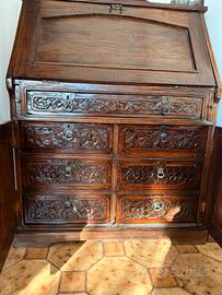 Scrittoio di fattura artigianale, intarsiato, in legno teak (teck, tek) resistente ad acqua, umidità e insetti parassiti. Possibilità di trasformarlo in scrittoio o di utilizzarlo come mobile contenitore. Grande cassetto intermedio. Nella parte inferiore 6 comodi cassetti nascosti da due ante.