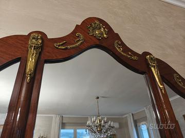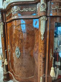 bellissima vetrina stile inglese con fregi in ottone e vetro bombato. specchio a tre ante. in perfette condizioni, ampio cassetto.