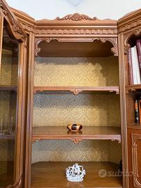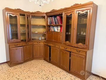 Vendo elegante mobile soggiorno angolare in stile classico, completo di vetrine, libreria centrale e ampi vani contenitori inferiori.