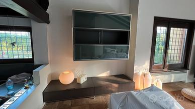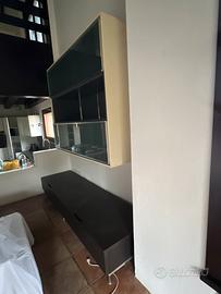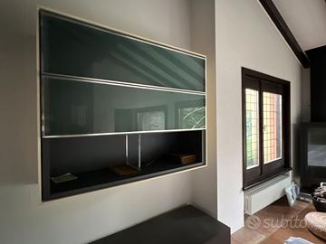 Mobile soggiorno composto da panca con cassettoni finitura rovere grigia dimensioni 240x65 Bussolotto con vetri scorrevoli altezza 130, larghezza 160, profondità 50.