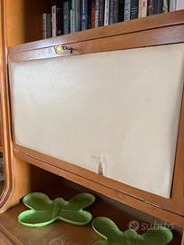 Mobile anni 60. Soggiorno con tavolo. Costituito da 3 componenti lineari 85x55x221(h) ed un elemento angolare 110x75x221. Tavolo rotondo con 6 sedie. Tracce di usura sui piani e sui rivestimenti, piedi del tavolo non a livello.