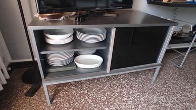 Mobile basso vetrinetta a due scomparti e due ripiani per scomparto.Ideale come mobile bar per custodire bicchieri e bottiglie di liquore oppure come appoggio per il TV di grandi dimensioni. Materiali: legno colore grigio, porte scorrevoli in cristallo fumé e telaio in acciaio. Dimensioni L97,P50,A60 cm Vendo a 40 euro