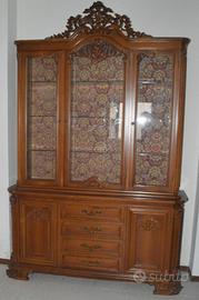 elegante mobile soggiorno vetrina in legno. Molto ben tenuto e rifinito con intagli decorazioni vetri colore oro. Base due ante in legno e quattro cassetti, dmensioni cm 165 x 50 x 86; Rialzo tre ante in vetro, dimensioni cm 155 x 38 x 135 senza decoro; 165 con decoro. Smontaggio e trasporto a carico dell'acquirente. Non spedisco.