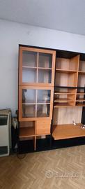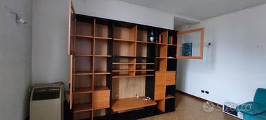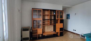Il mobile soggiorno di colore legno con bordi di colore nero. È scomponibile in 3 parti lunghezza totale m 2,55 . La prima parte e l' ultima misurano cm 72 la parte centrale cm107, altezza m 2,20 profondità cm 38 . Il piano TV ha un pianale di cm 55 .
