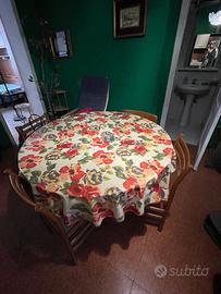 Tavolo tondo diametro 120 cm allungabile colore bianco/noce chiaro con sedie e mobile soggiorno.