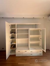 Mobile soggiorno in legno verniciato bianco in ottimo stato. Composto da armadio lungo con anta, 3 ripiani, una credenzina chiusa, 2 sportelli e 2 cassettoni scorrevoli in basso . Ritiro di persona Misure: L 226cm P 60 cm H 225 cm