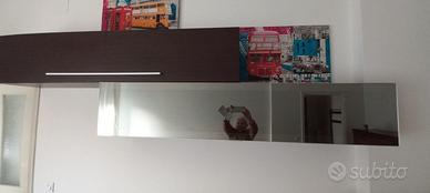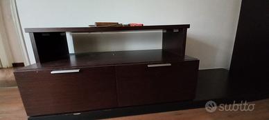 Mobile da soggiorno Ikea, composto da diversi elementi posizionati su una pedana. In buono stato sia dentro che fuori (l'unico punto rovinato è quello che si vede in foto). Misure: cassettiera: L 53, P 44, H 116 mobile tv: L 120, P 45, H 66 pensili: L 180, p, 35, H 36