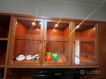 Il mobile è composto da più moduli con vetrine in vetro illuminate, vani chiusi, cassetti e spazio centrale per TV, perfetto per riporre ed esporre cristalleria, servizi, libri e oggetti decorativi.