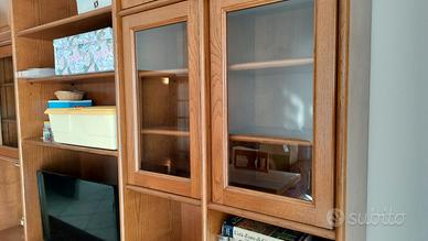 Mobile porta tv, libreria, con vetrine, in massello di castagno, smontaggio e trasporto a carico del compratore misure: altezza 260 cm larghezza 270 cm profondità 60 cm