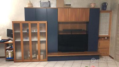 mobile soggiorno in noce nazionale impiallacciato più particolari laccati in ottime condizioni con cassetti sotto vano TV più vetrina a sx apertura a pacchetto misura cm.337 profondità massima cm.60 possibilità trasporto e montaggio da concordare