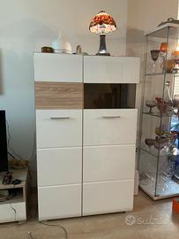 Composizione in finitura bianco lucido e legno naturale. 2 Colonne laterali e pensile sospeso in buone condizioni. Ideale per soggiorno moderno e funzionale Ritiro in zona Niguarda