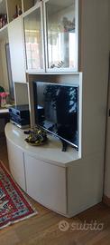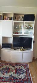 Mobile laccato color avorio, dimensioni 290 l x 230 h x 70 p max completamente smontabile con bussole. Eventualmente è possibile eliminare la parte sinistra del vano a giorno riducendo la larghezza a 160 cm. Presenta qualche danno alla laccatura, si vedano foto. Sono esclusi dalla vendita tutti gli oggetti compresi nelle immagini e diversi dal mobile stesso. Disponibile dalla seconda metà di giugno