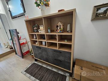 Struttura in legno effetto rovere, con ripiani a vista e due cassetti spaziosi + due ante.