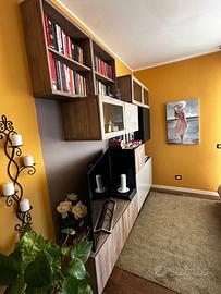 Attualmente composto come in foto: larghezza 240, altezza 230/250 da terra, profondità 42 per i moduli con anta e 29 cm per i due moduli a giorno.