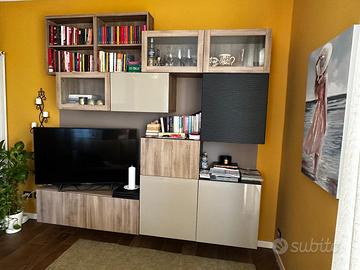 Mobile componibile da soggiorno IKEA Besta costituito da 6 moduli con ante (con vetrinetta e laccate) e due moduli a giorno.