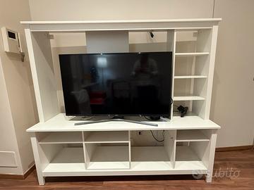 Vendo mobile da soggiorno in stile moderno, interamente bianco, con una struttura piuttosto ampia e suddivisa in più zone funzionali.