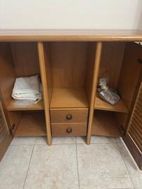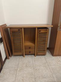 Mobile soggiorno con spazio per la tv e cristalliera attaccata. Altro mobile basso con apertura ad ante e cassetti piccoli.