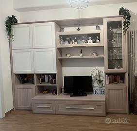 Vendo mobile da soggiorno completo in ottime condizioni, stile moderno e funzionale, ideale per zona living o sala TV. Il mobile è composto da: •Base porta TV con cassetti e vani contenitori •Pensili superiori chiusi •Mensole a giorno •Vetrina laterale con ripiani in vetro Misure principali: •Larghezza base: 295 cm •Altezza colonna/vetrina: circa 227 cm •Profondità colonna: circa 45 cm Colore legno chiaro, facilmente abbinabile a diversi stili di arredamento. Condizioni: Usato ma tenuto molto bene, senza difetti evidenti. Importante: •Smontaggio e trasporto a carico dell’acquirente •Disponibile a Roma Contatto: Scrivimi in privato per ulteriori informazioni o per venire a vederlo.