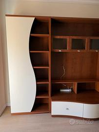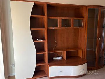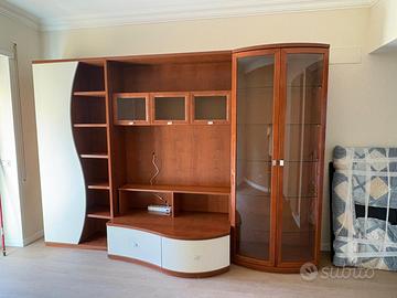 Vendo mobile soggiorno componibile dal design moderno e curato. La struttura principale è in caldo legno color ciliegio, arricchita da elementi in finitura panna. Il mobile è composto da diverse sezioni: • Colonna con ante: Ampio spazio chiuso per riporre oggetti. • Vano TV: Dimensioni perfette per TV a schermo piatto. • Scaffali aperti: Ideali per libri, decorazioni o dispositivi multimediali. • Vetrina angolare: Con ripiani in vetro. • Cassettoni: Nella parte inferiore, offrono spazio aggiuntivo per riporre oggetti.