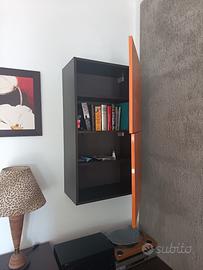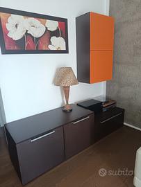 Mobile soggiorno, ottima struttura, acquistato da mobiliere di Saronno, elegante, in finitura wengè, con pensile laccato arancione a tre ripiani. Due ante per un totale di 120 cm più 90 cm di un ampio cassettone. Profondità 55 cm. Ideale mobile TV/stereo.