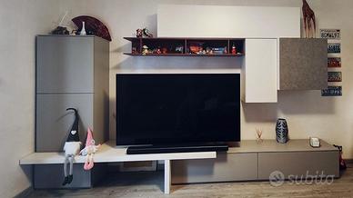 URGENTE - Vendo mobile soggiorno moderno acquistato da Asta del Mobile. Il mobile si presenta color betulla e grigio cemento, con un dettaglio laccato bordeaux, all'interno sono presenti delle mensole in vetro. Privo di difetti, è come appena acquistato. Vendo a causa di cambio casa e impossibilità di adattarlo.