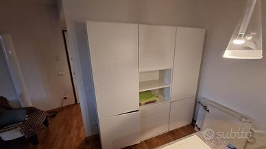 Mobile Molteni serie 505 - Laccato colore bianco calce, ante in vetro, elemento centrale con cassetti, vani a giorno ed antina.Lunghezza totale 180 cm - Altezza 200 cm -